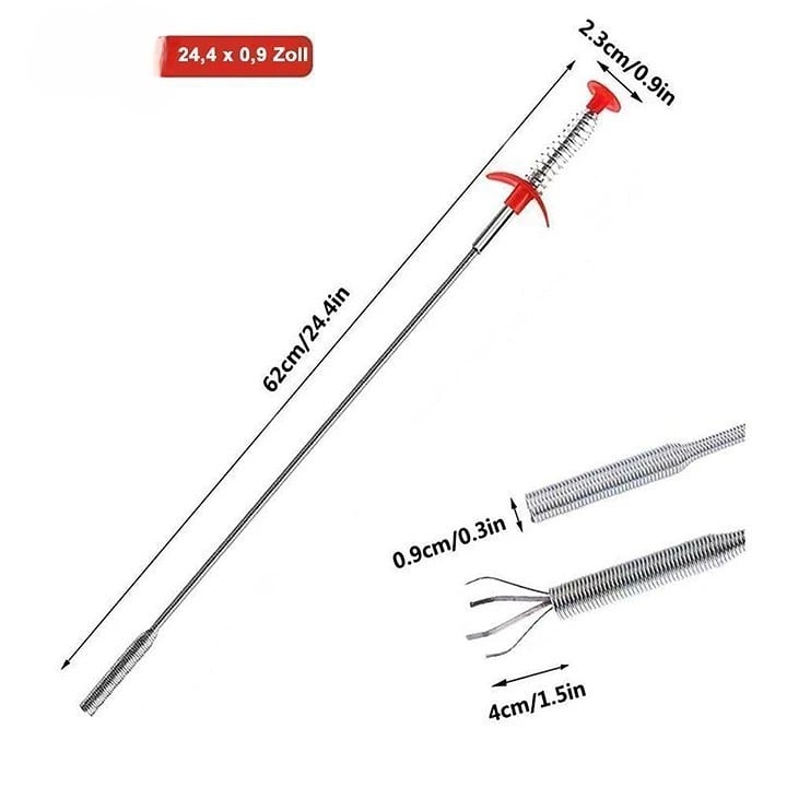 - Fácil de usar: Elimina fácilmente los atascos del desagüe. El cabello y las hojas pueden engancharse con un simple movimiento del mango.