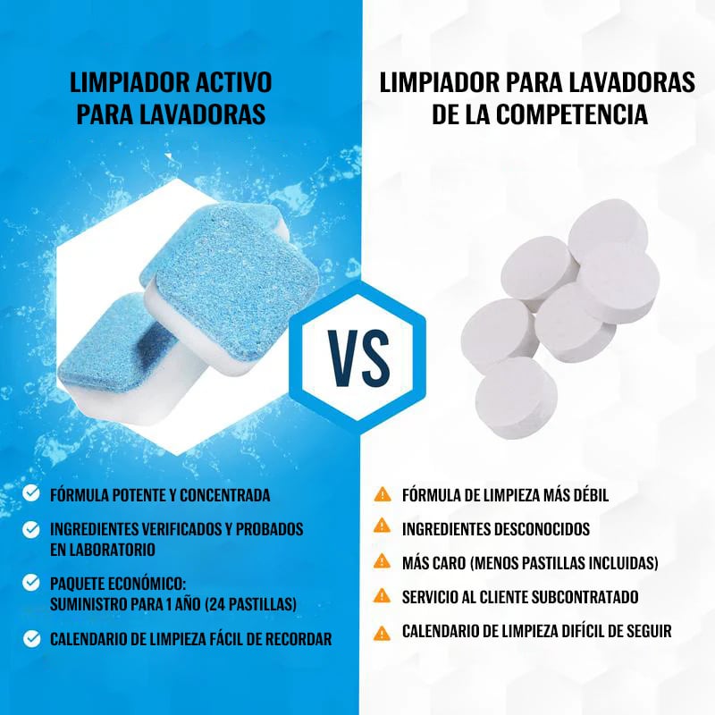 Sin productos químicos agresivos: Nuestras tabletas limpiadoras generan una espuma efervescente natural que limpia las zonas internas de la lavadora. Seguras para sistemas sépticos.