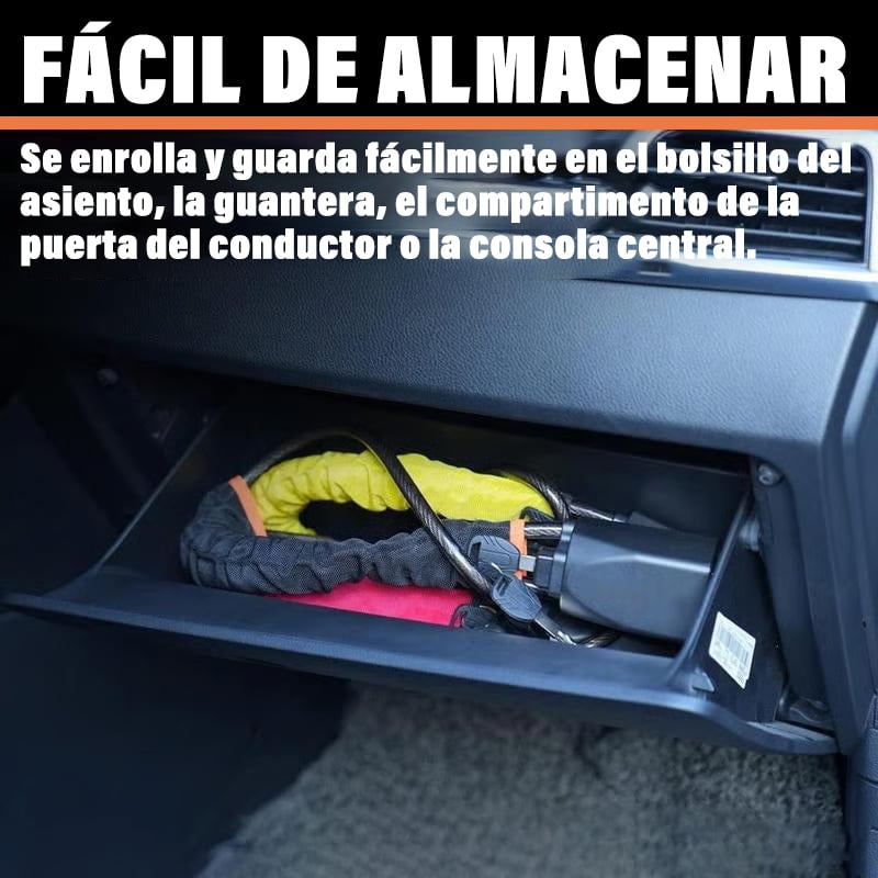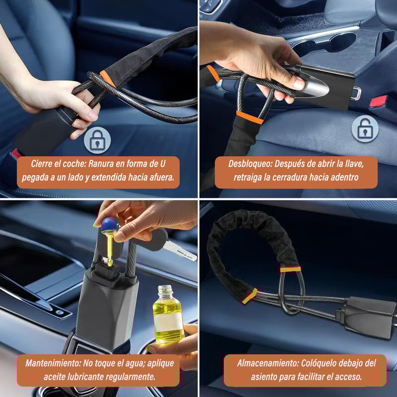 Este candado de volante altamente visible evita que se gire el volante y bloquea el uso del cinturón de seguridad, disuadiendo eficazmente el robo. Una barrera visual y física fuerte que hace pensar dos veces a los ladrones.
