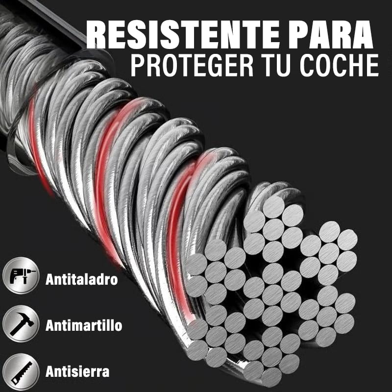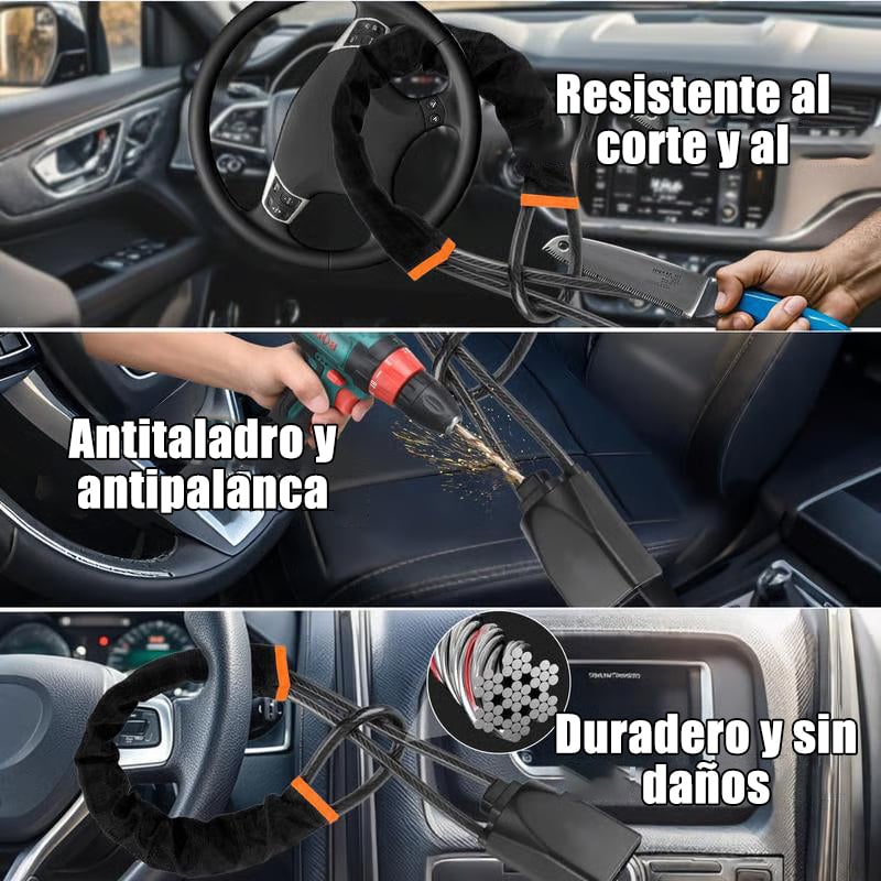 Fabricado con cable de acero trenzado de alta resistencia —un 50% más grueso que los candados estándar— y recubierto con PVC para proteger el volante y resistir la oxidación.