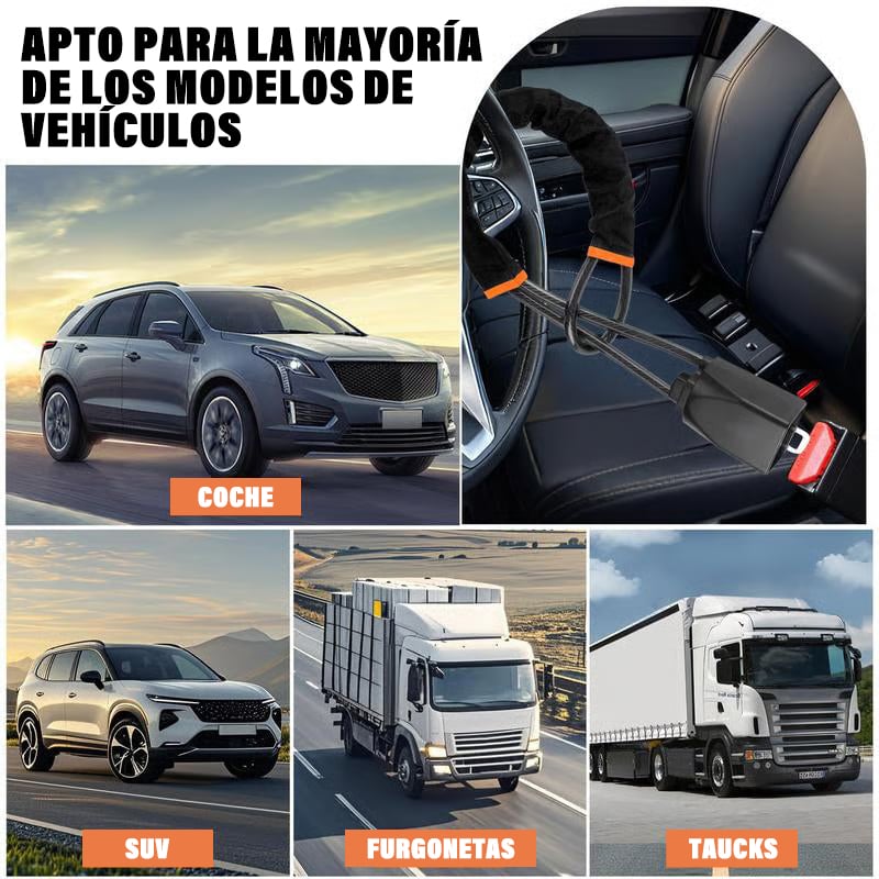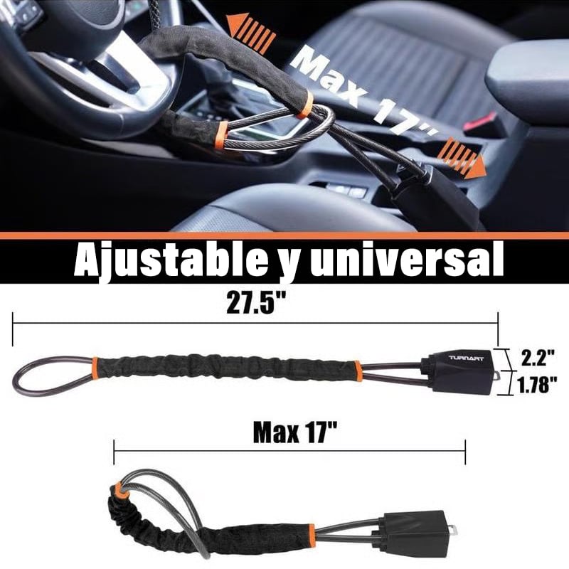 El cable ajustable se adapta a la mayoría de coches, camionetas, SUVs y furgonetas. Se bloquea de forma segura entre el volante y el asiento para mayor compatibilidad y tranquilidad.